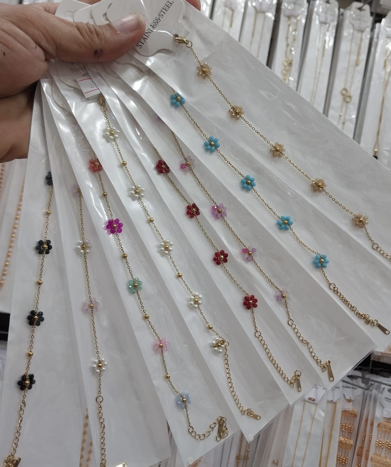Each bracelet features beautifully crafted mini flower charms with a golden center, available in multiple elegant colors to match every style.